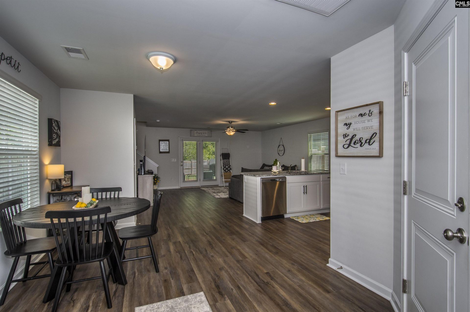 Welcome to this beautifully maintained two-story home in Jessamine Place, offering 3 bedrooms and 2.5 baths with a thoughtfully designed open layout. The main level features seamless flow between the kitchen, dining, and living areas, ideal for everyday living and entertaining, along with stylish and durable LVP flooring and a convenient powder room. The kitchen is equipped with granite countertops, a spacious peninsula, and a pantry for added storage.Upstairs, the primary suite showcases a vaulted ceiling, dual sink vanity with granite countertops, a private bath, and a generous walk-in closet. Two additional bedrooms, a shared full bath, and an upstairs laundry room provide both comfort and functionality.Step outside to enjoy a fenced backyard that backs to a protected tree line, offering a peaceful and private setting. A covered patio extends your outdoor living space, and a full yard irrigation system helps maintain the landscaping with ease. The owner has also added gutters and gutter guards for added convenience and peace of mind. Located in the highly sought-after Lexington One School District, this like-new home is one you won't want to miss. Disclaimer: CMLS has not reviewed and, therefore, does not endorse vendors who may appear in listings.